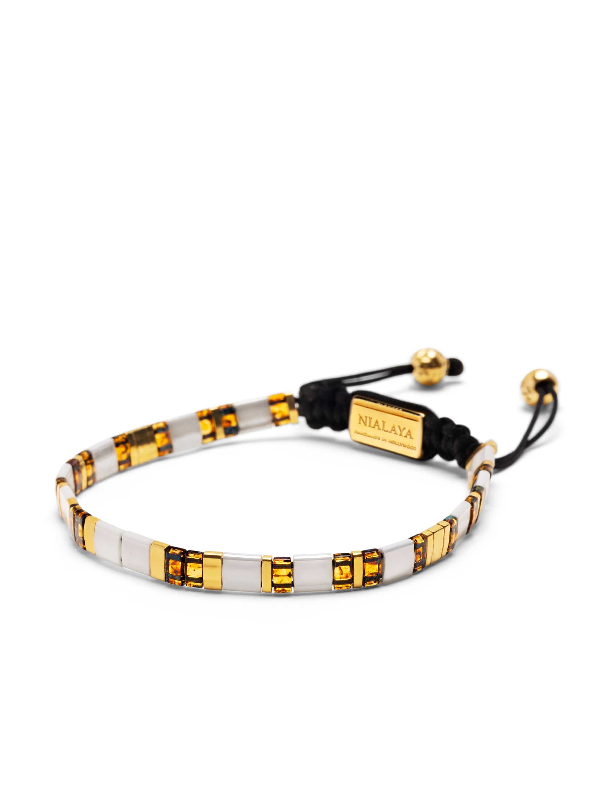 Men's Bracelet with White, Marbled Amber and Gold Miyuki Tila Beads
