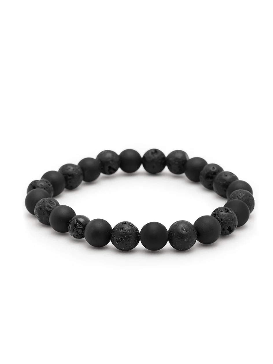 Strung with masculine matte Onyx and Lava Stone, this bracelet will add a touch of bohemian luxury to your looks. Finished with a black plated stainless steel logo ball, this item is a classic everyday bracelet . It's strung on an elastic strand to slip on with ease. Pair it with a silver bangle for a cool, layered look!